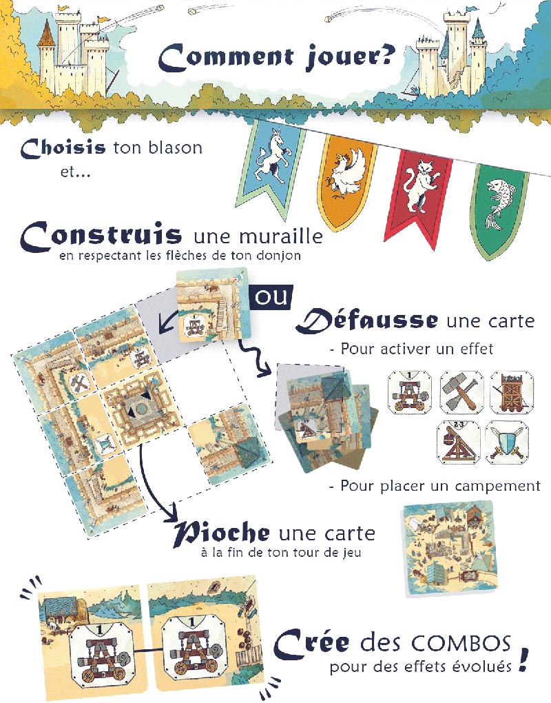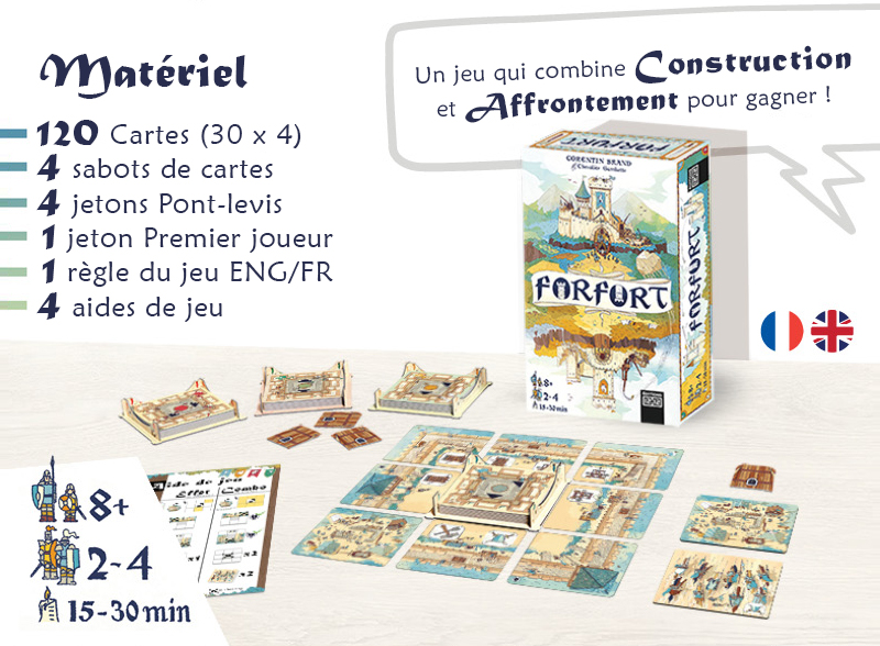 120 Cartes (88 Murailles, 16 Armées, 16 Campements), 4 Sabots de cartes, 4 Jetons ‘Pont-levis’, 1 jeton ‘Premier joueur’, 1 Règle du jeu FR/ENG, 4 Aides de jeu